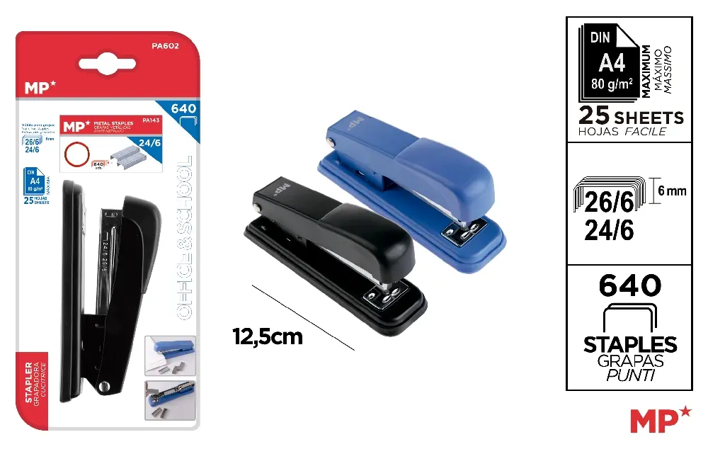Home>MP CANCELLERIA>CUCITRICI, PERFORATORI E LEVAPUNTI>MP PINZATRICE 24/6 COL. ASS. + CONF. RICARICA PUNT
